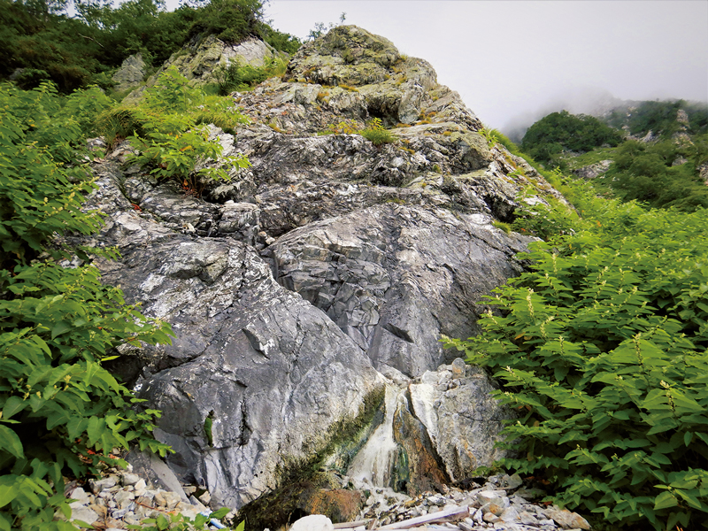 小屋の裏側にある巨大な岩が白馬鑓温泉の源泉で、岩の割れ目から温泉が湧き出ている。源泉の温度は43.1℃。疲労回復や筋肉痛にも効くとされ、登山に最適な効能だ。