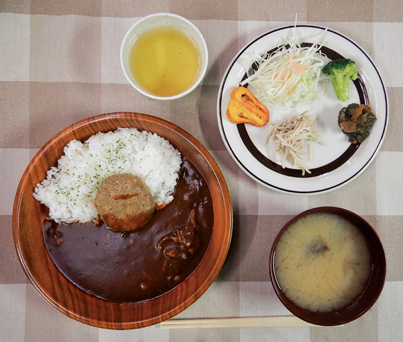 【夕食】試作に試作を重ねて作った自慢のハヤシライスが定番メニュー。味わい深く、とてもおいしい。ハヤシライスはおかわりができるのもうれしい。付け合わせはハンバークに副菜など。