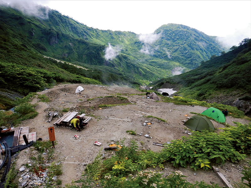 露天風呂の下に広がるテント場スペース。今年は完全予約制だ。学生証を提示することで1人あたり1,000円値引きされる学生割引もある。温泉は別途1,500円で利用できる。夕食の利用は受け付けていないがお弁当は注文可能。