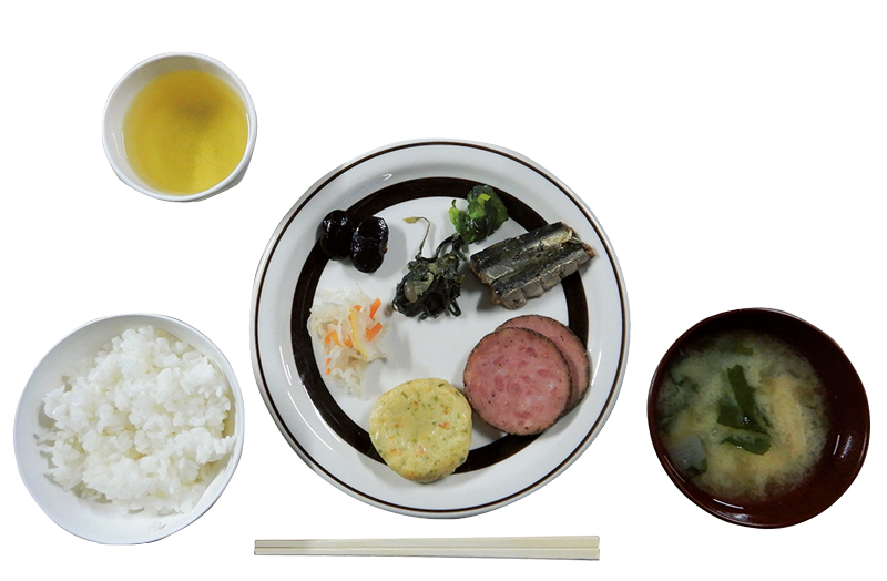 【朝食】朝食もご飯はおかわり自由。この日のメニューは豆腐の肉味噌餡包み、ボロニアソーセージ、イワシのショウガ煮、切り干し大根の酢漬け、花豆の煮もの、キュウリの漬物、野沢菜。