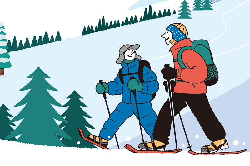 スノーシューでフカフカの雪の上を歩く遊び方。傾斜の緩い地形で行なわれることが多く、必ずしも山頂をめざす必要はない。ツアーが企画されることも多いので、雪山入門にぴったり。雪山登山の第一歩として、スノーシューツアーに参加してみるといいだろう。