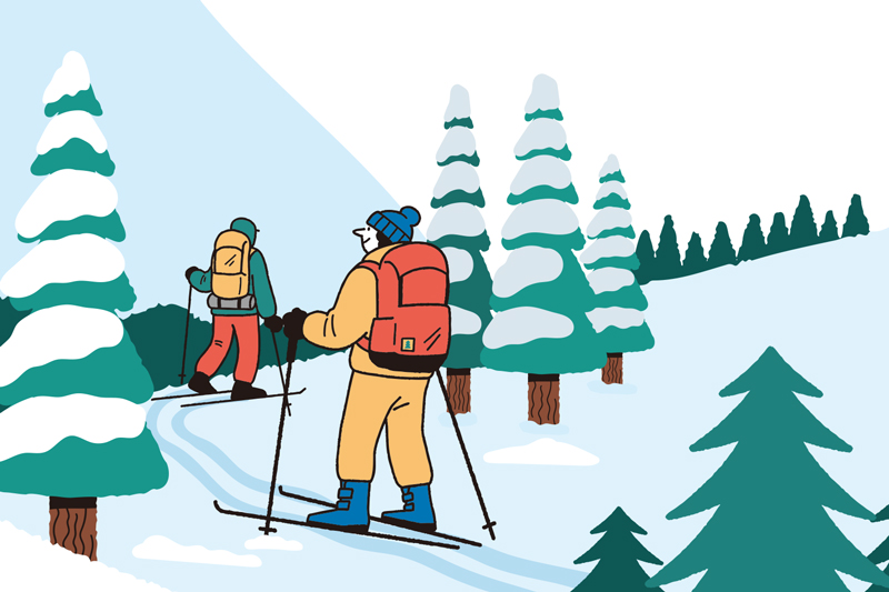 同じスキーでも、滑りに特化したバックカントリースキーと違い、クロスカントリースキーは歩くことに特化した遊びといえる。雪面にグリップするウロコ状の特殊な凹凸のある板を履いて、慣れれば登りも下りもノンストップで行動可能。気持ちのいい雪上ハイキングを楽しめる。