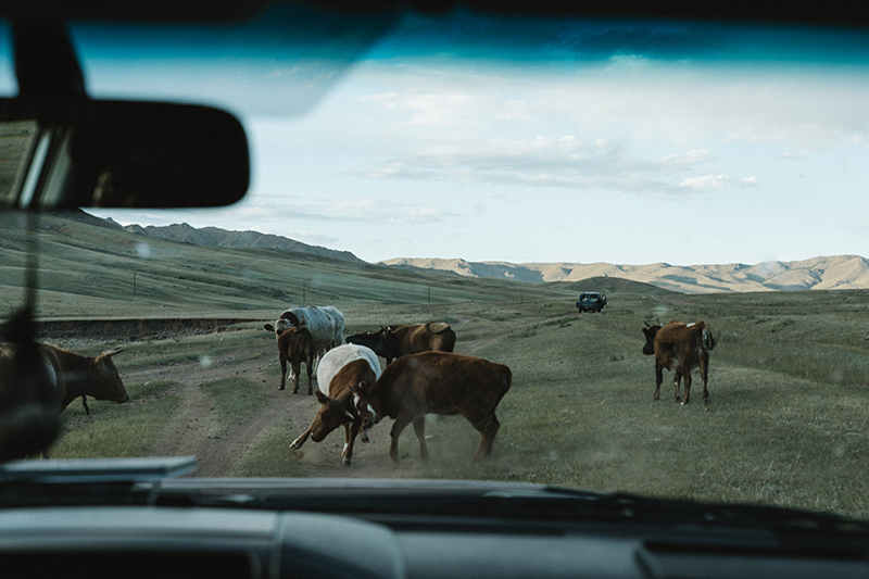 牛が道を塞げばクラクションを鳴らし、動かなければ退くのを待つ。モンゴルでの旅を始めたころは、このクルマ移動すらワクワクして、窓の外に釘付けになったものだが、いまとなってはクルマに乗り込んで5分と待たずに熟睡するという特殊能力が身についていた。この日の朝焼けがきれいだったことは、あとからフレルに聞いて知った。