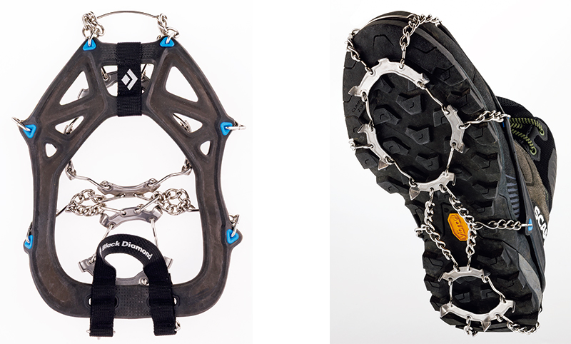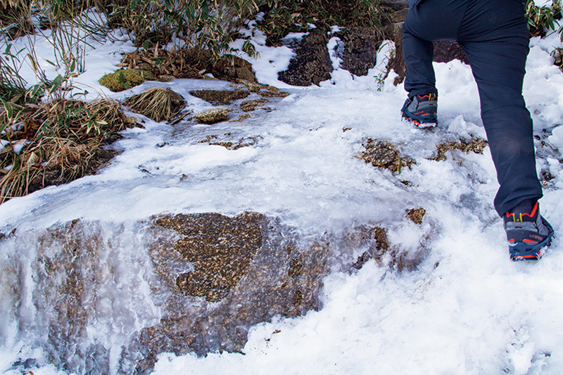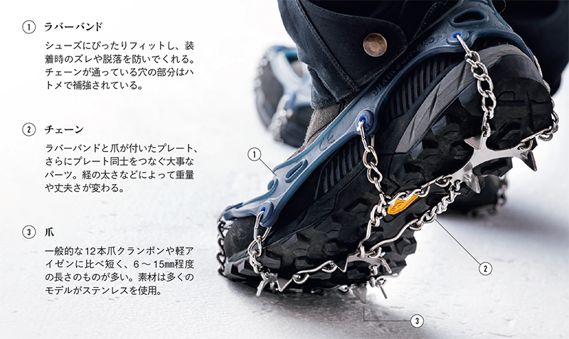 本格的な12本爪クランポンを使うほどの斜度や雪の量ではないが、雪や氷が道を覆っていて、滑り止めが必要。そんなときに活躍するのがチェーンスパイクだ。これまでは爪が4~6本の軽アイゼンが主流だったが、装着のしやすさ、軽さなどが支持され、いまでは多くの登山者が使用するようになっている。