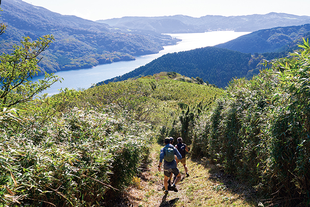 走り出してから数分足らずで登山口に着き、温まった体で山道を登り始める。登山道を半分くらい登ると、眼下に陽の光を反射する芦ノ湖の景色が広がった。