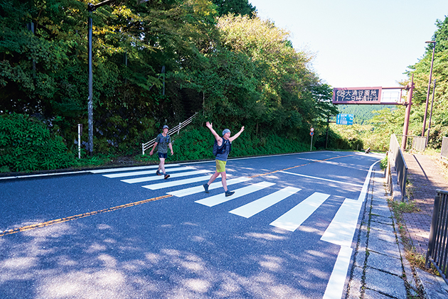 喘ぎながらそそり立つ壁を越えて、やっとの思いで屏風山に到着。次の目的地は、江戸の時代から続く甘酒茶屋である。山道を下ってから車道を少し進むと、茅葺き屋根の古めかしい建物が見えてきた。