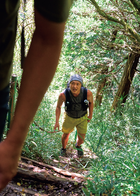 箱根外輪山の登山道は、ところどころに階段があるものの、比較的走りやすいトレイルが続いていた。下りになると気分の高揚に合わせて、足取りも弾むように速くなる。しかし、登りになると動きが一変。途端に歩みが遅くなり、テンションもガクンと下がる。普段の登山より背負っている荷物が軽いとはいえ、トレランスタイルでの登りはキツイ。少しでも速く歩こうとすればなおさらで、わずかな傾斜でも胸がはち切れるかと思うほどの苦しさに襲われる。