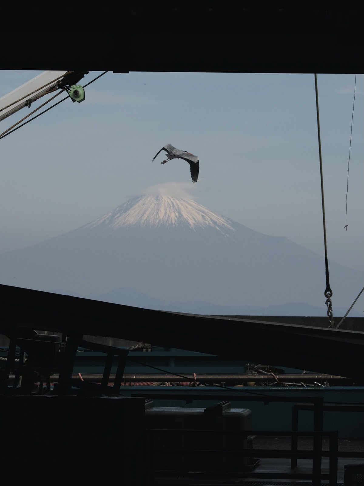 神秘的な佇まいの富士山と、大きく広げたサギの翼が重なった奇跡のような瞬間。200mm相当の焦点距離で高倍率ズームレンズを装着していたからこそ撮れた1枚です。