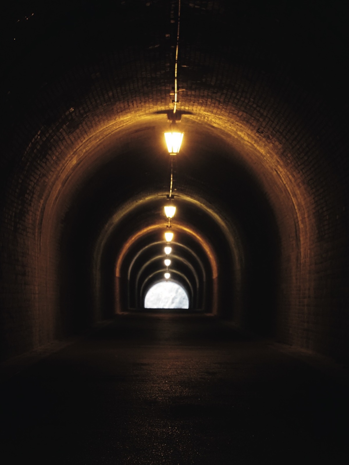 歴史を感じさせるレンガ造りのトンネル。オレンジの灯火を頼りに歩くなか、静謐な空気を収めたくシャッターを切りました。手ぶれ補正が強力なので暗闇でも安心です。