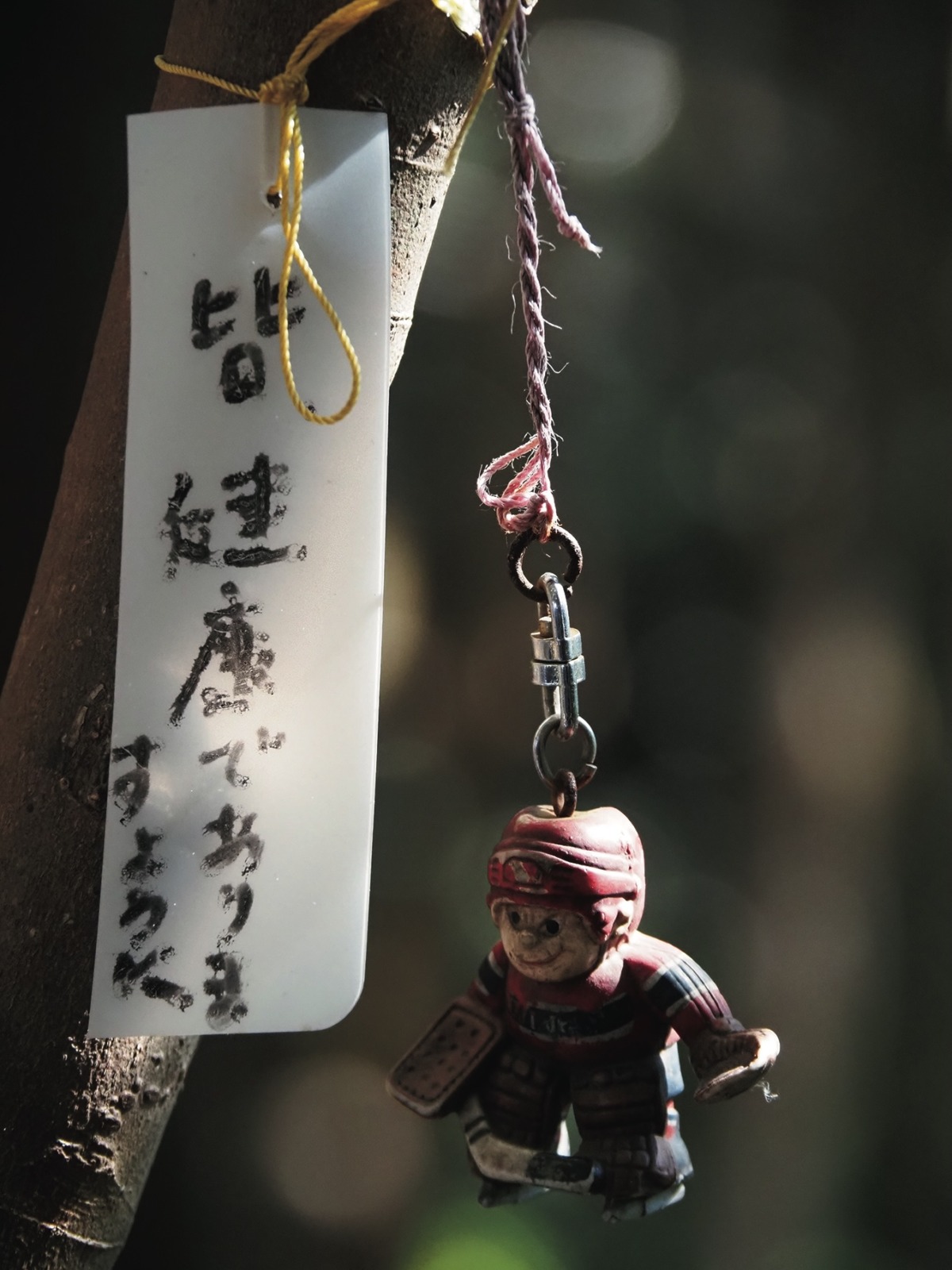 自分がお店から山へ向かう人を見送るときのように、歩く人への想いが込められたキーホルダーを山で見つけて。望遠で撮影したので、奥の風景もきれいにボケてくれました。