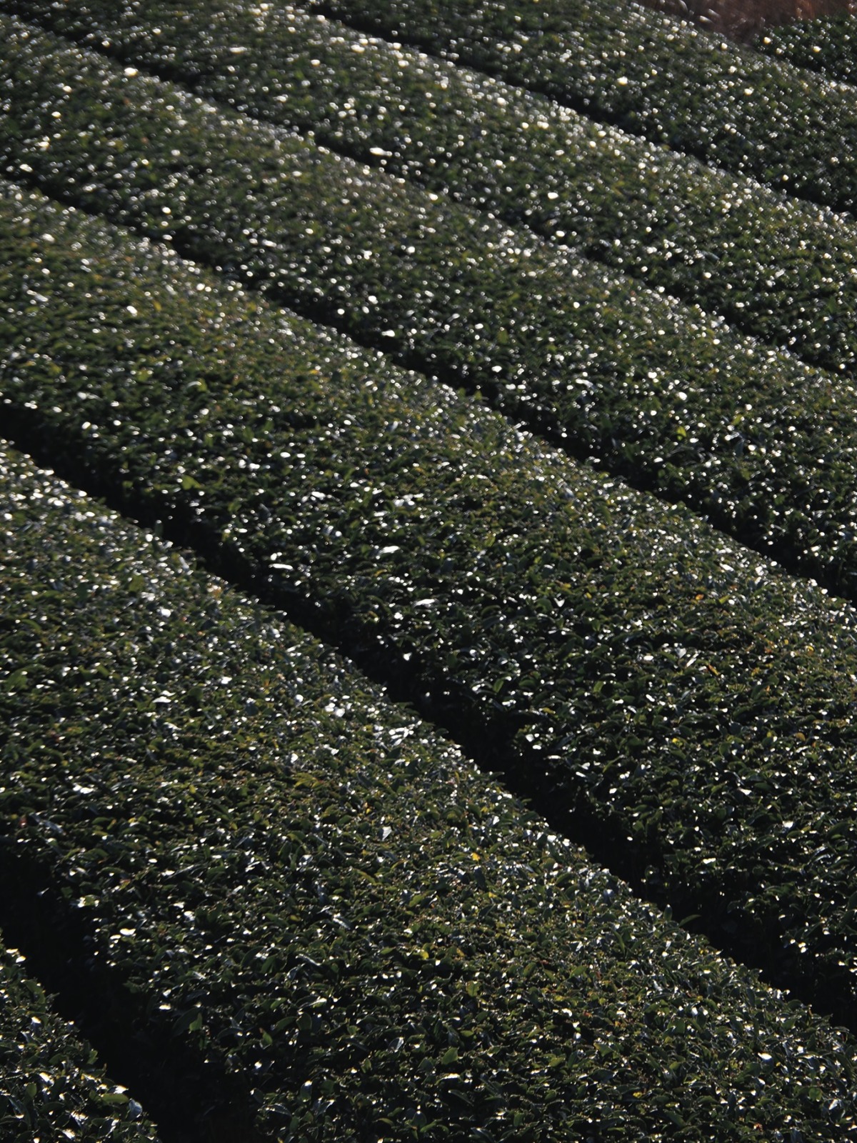 規則的に並ぶ茶畑が太陽の光で輝く、静岡らしい風景。茶畑からは少し離れた場所からでしたが、200mm相当の望遠だからこそのボケ感が出て、バランスよく収まりました。