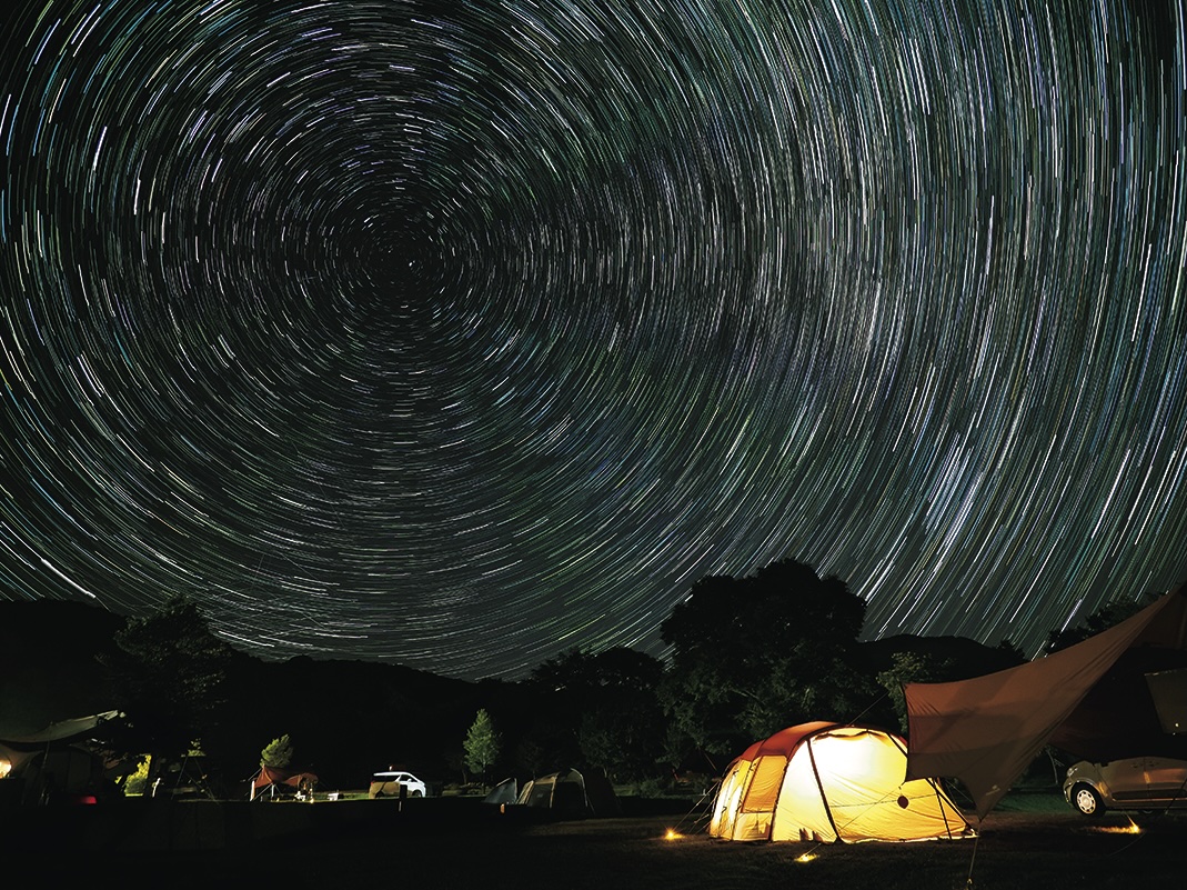 同じシャッタースピードで複数の写真を重ねて光跡を写す「ライブコンポジット」(左写真)を使えば、星の光跡なども手軽に撮影可能。明るさが変化した部分のみ合成されるので、テントや夜景などを入れてもきれいに写り、星空写真をフォトジェニックに仕上げることができる。