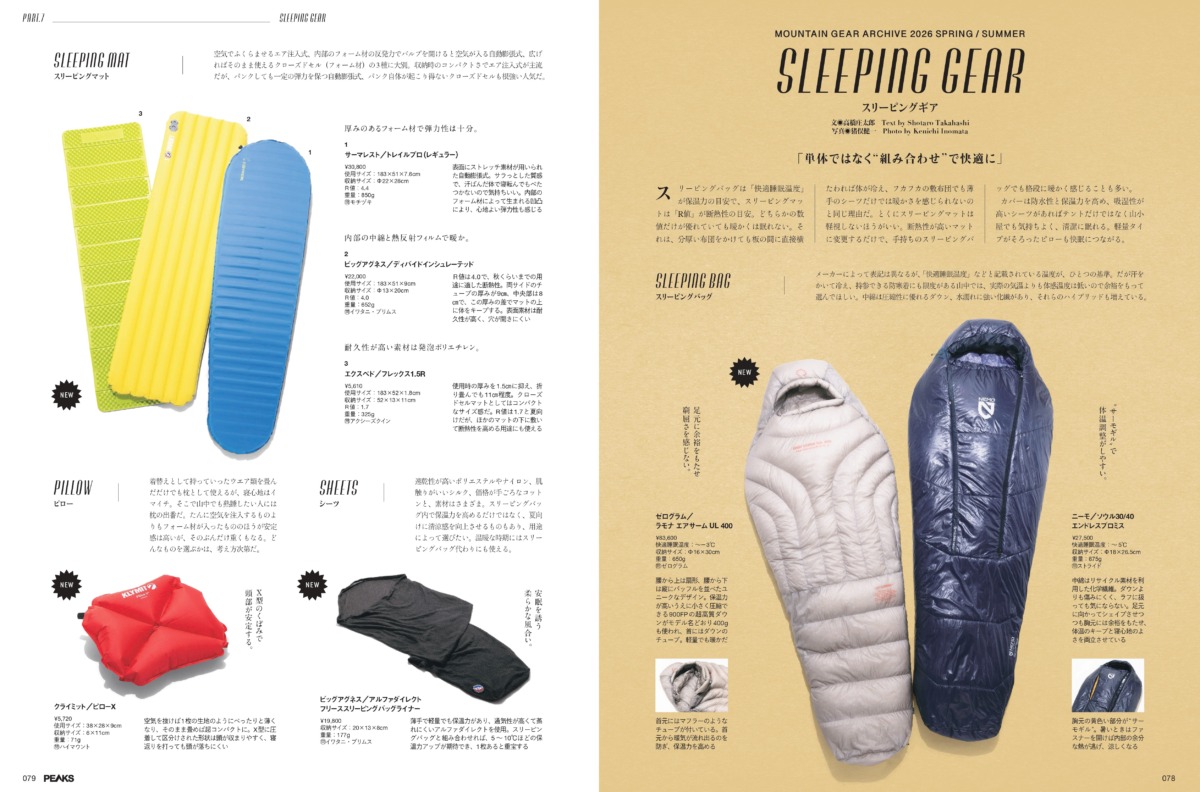 テントに負けず劣らず重要で、睡眠の質を左右するのがスリーピングギア。スリーピングバッグ(寝袋)からマット、シーツにピローまで、組み合わせることで快眠に導いてくれるアイテムを多数、掲載しています!