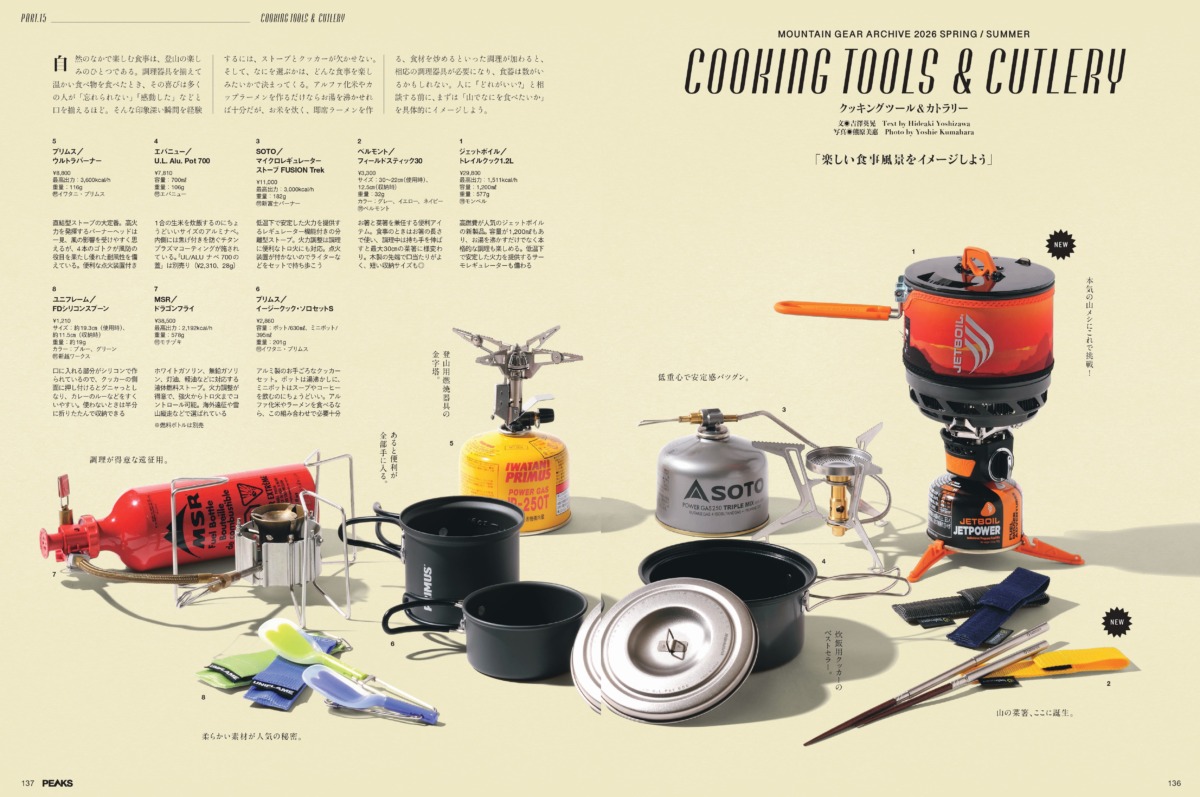 山での楽しみのひとつ、“食”を支えるクッキングツール(調理器具)も大切。ストーブやクッカー、ケトルやフライパン、さらにスプーンや箸などのカトラリーまで、いろいろなレシピ&調理スタイルに対応するアイテムを幅広く掲載しています。山ごはんになにを食べたいかを思い描きながら、多彩なアイテムを眺めてみてください。