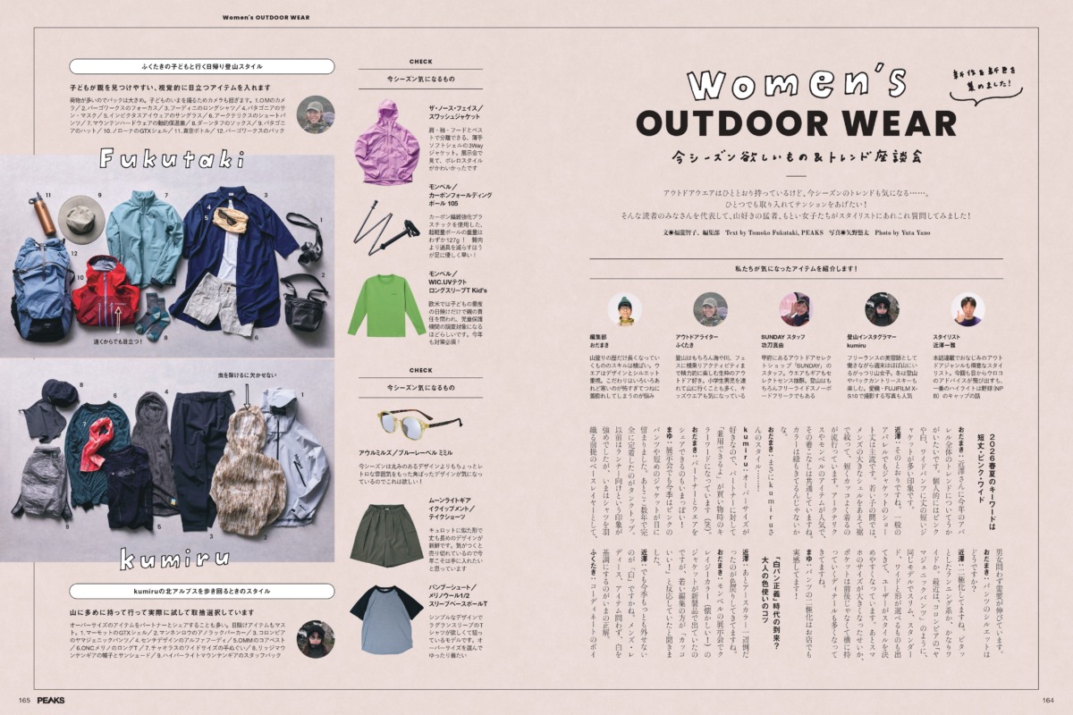 カタログパートに続くのは、女性目線でアウトドアウエアのトレンドを探るトレンド座談会。山好き女子たちが集まり、2026年春夏シーズンの気になるアイテムやトレンドについて語り合いました。