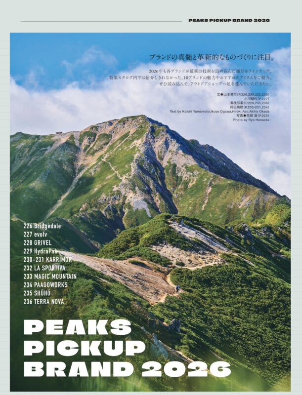 特集カタログでは紹介しきれなかったブランドの魅力とともに、今シーズン注目のアイテムをピックアップ。登山シーンを支える老舗ブランドから新鋭ブランドまで、ものづくりの背景や思想に触れながら、その魅力と最新プロダクトを紹介します。