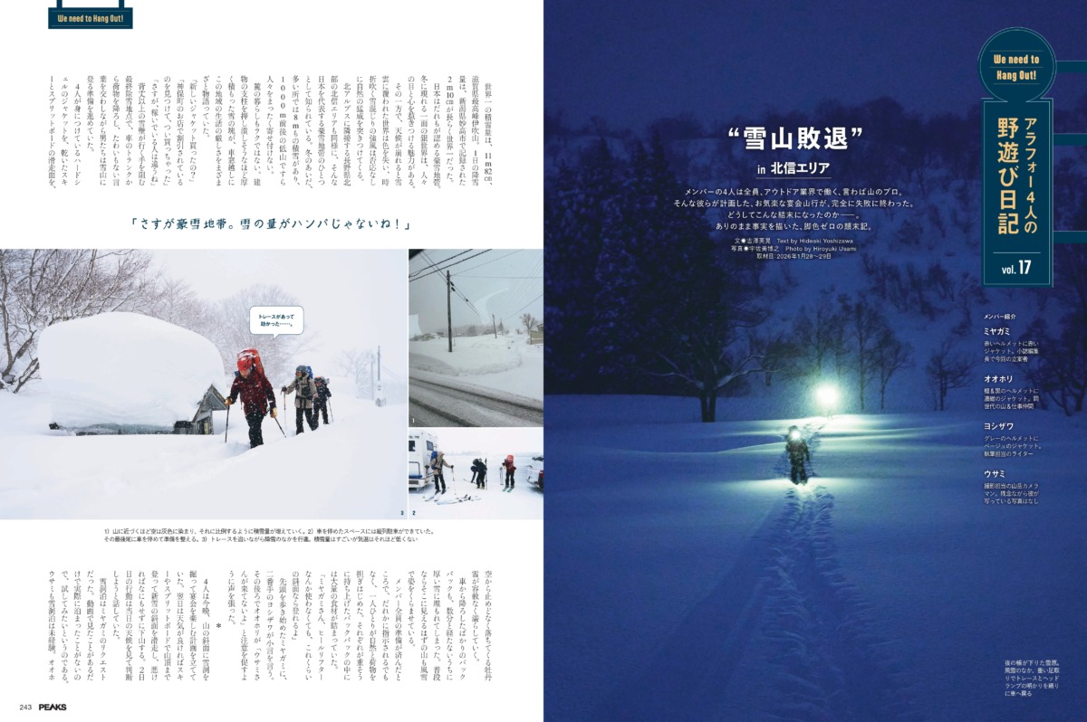 アウトドア業界で働くアラフォー4人が集まり、雪山での雪洞泊と宴会を目論んだ今回の野遊び。メンバー全員、山に関してはそれなりに経験を積んできたはずの面々です。