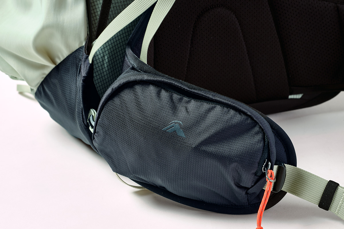 行動食や地図、小さなタオルなどの収納に適したポケットを、ウエストベルトの両サイドに配置。使い勝手のよさが細部にまで宿る。