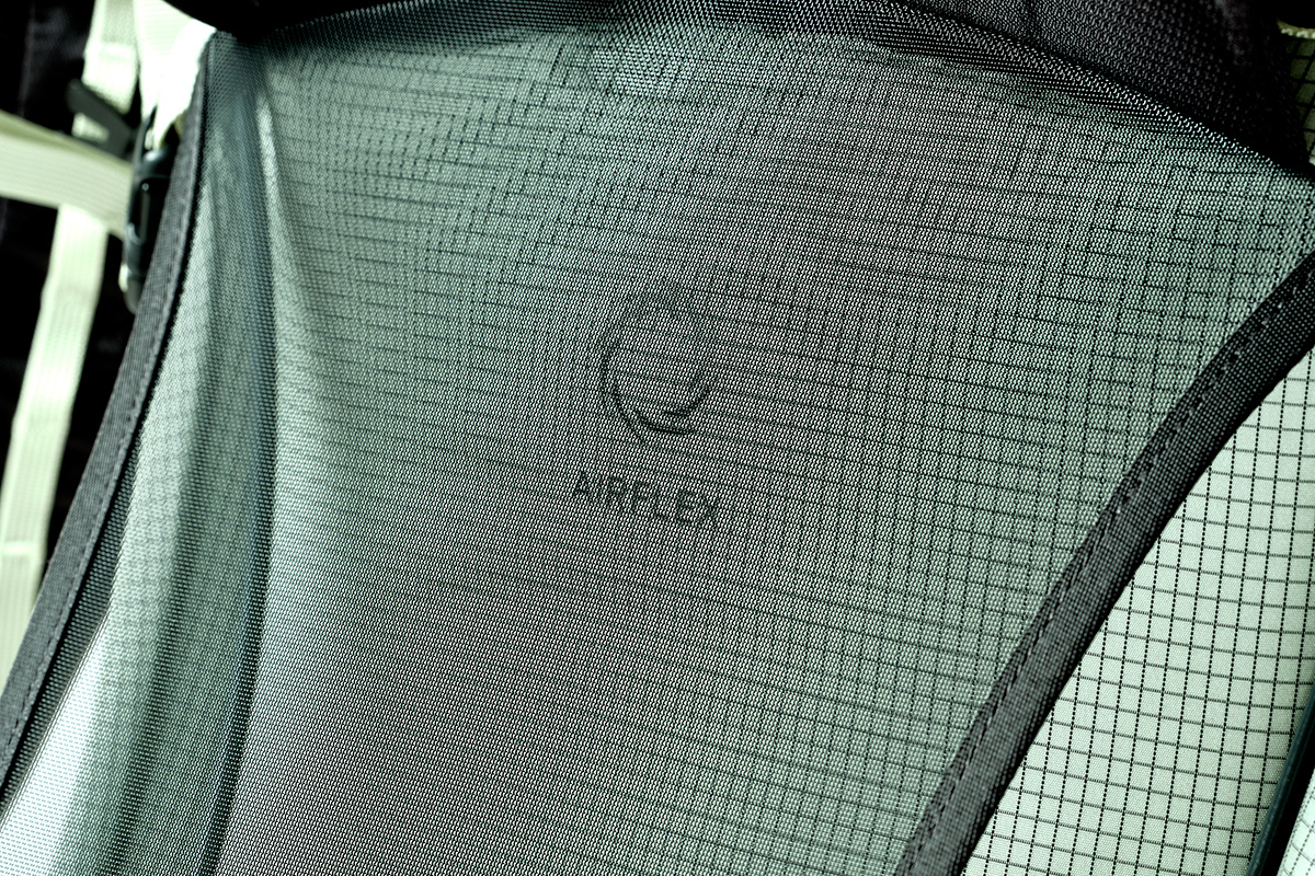 バックパック本体と背中を大きく離し、抜群の通気性を確保する「AIRFLEXトランポリン」ハーネスを採用。快適な背負い心地を約束。