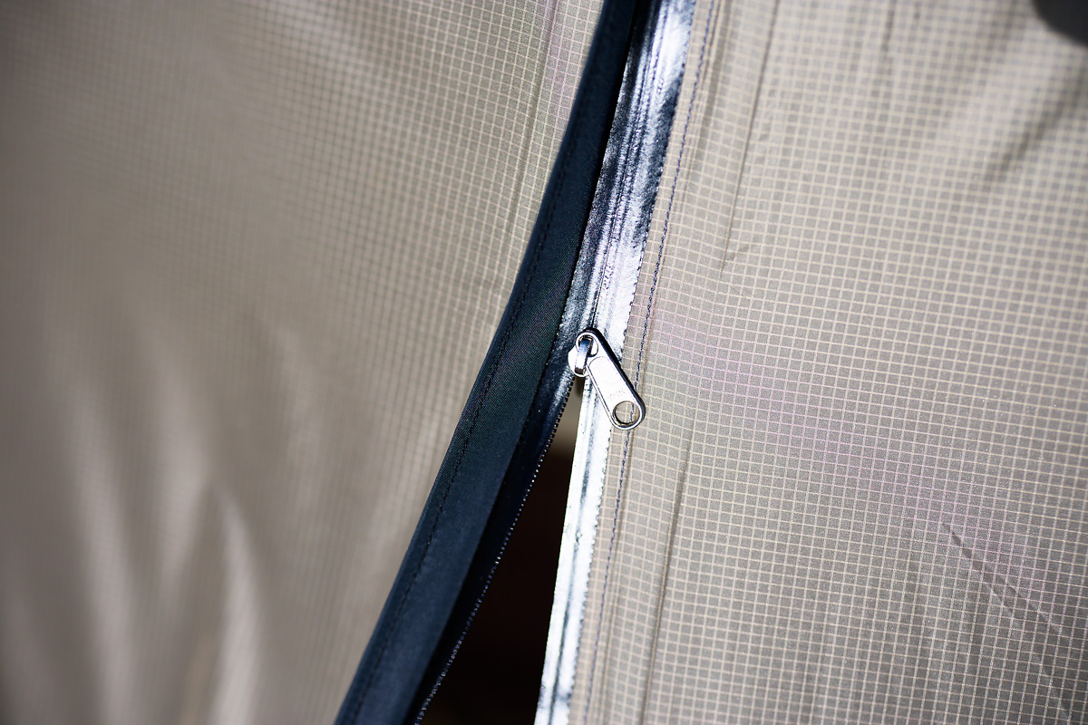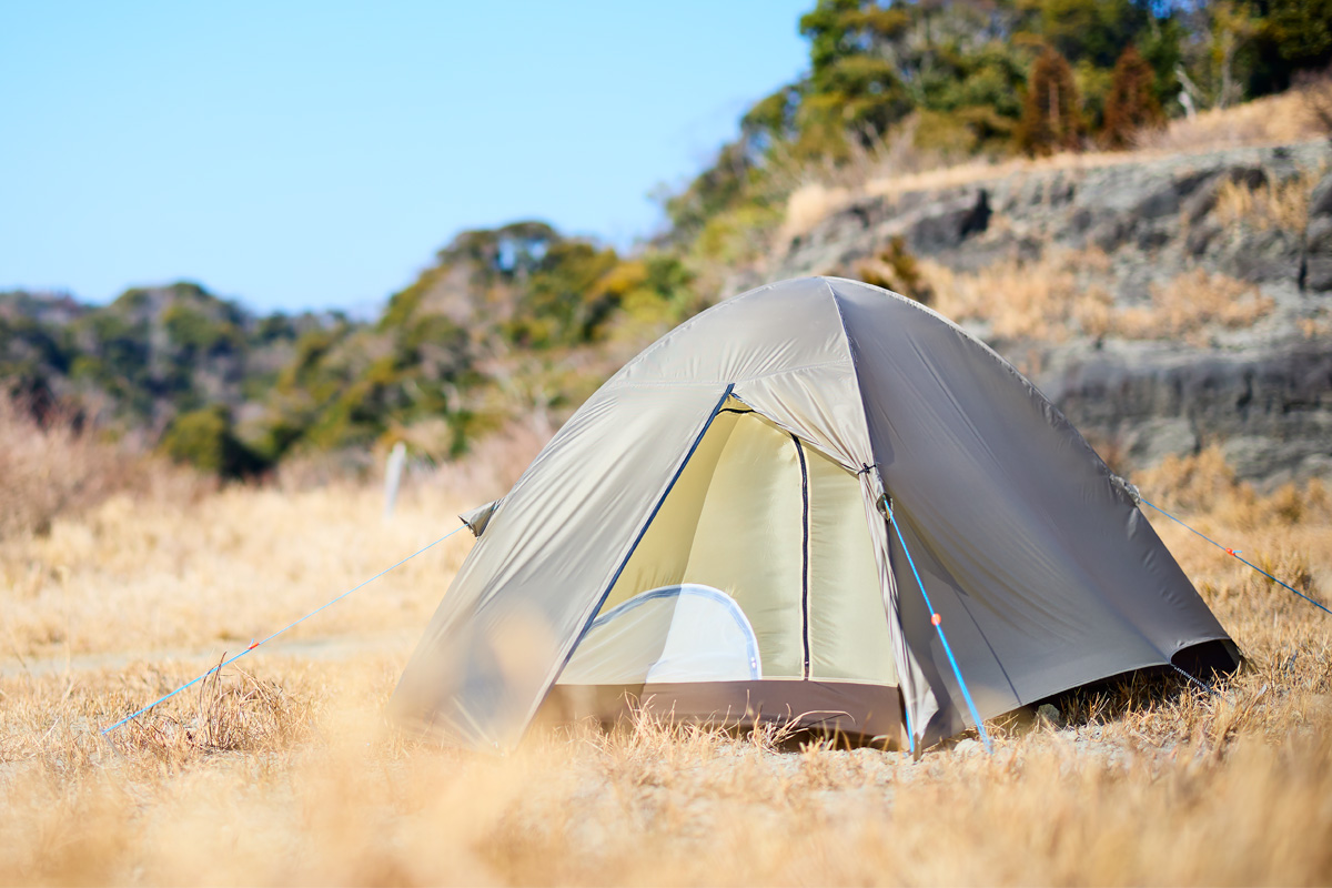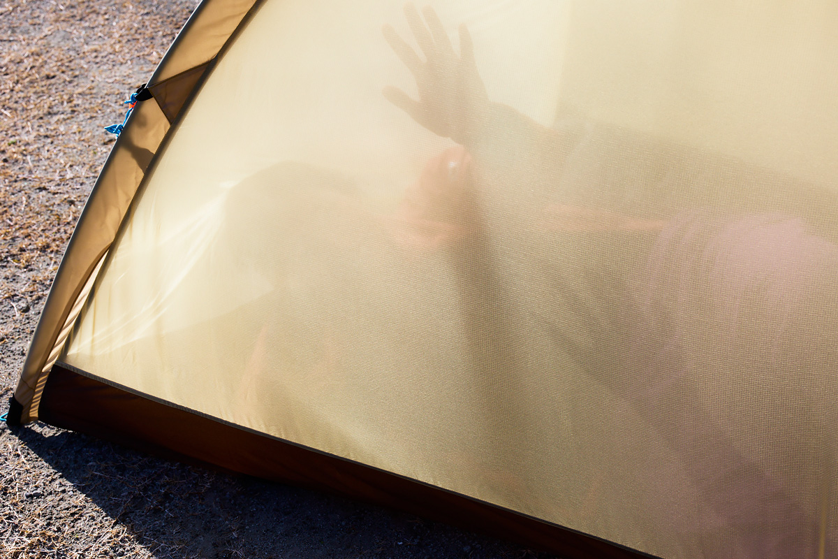 軽さ以外にも少しだけ異なる点もある。インナーテントでいうと、入口に付けられたメッシュの範囲が全面から小窓へと変更になった。またフライシートの前室下部を広くするために備えられていたガイラインをなくしている。これらも軽量化を担うポイントだ。フライのカラーは軽やかなライトグレー。この色味も軽さを演出しているように感じる。