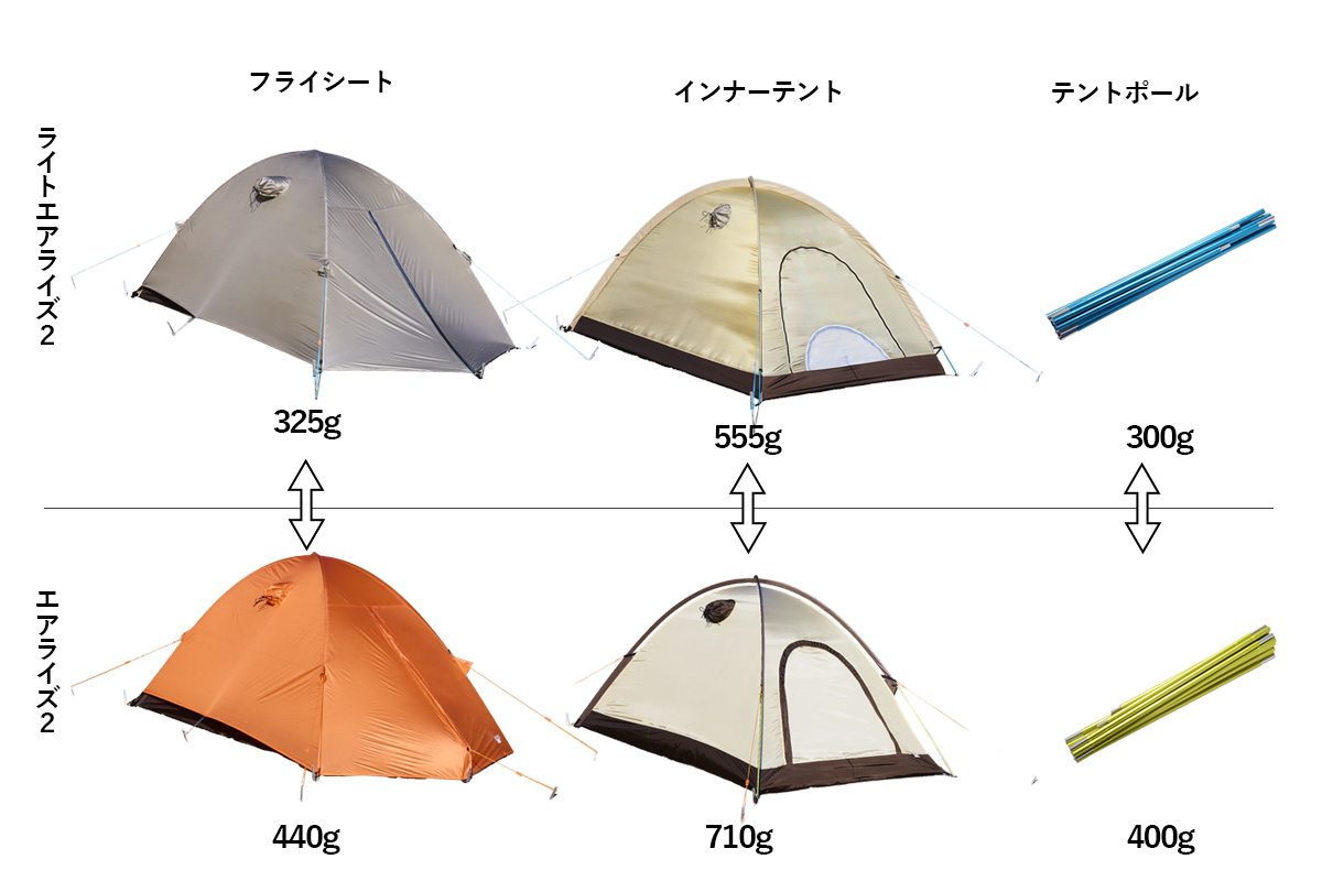 ライトエアライズとエアライズで互換性があるのが大きなポイント。どちらもパーツごとの購入が可能なため、好みに合わせてフライシートとインナーテントを組み合わせることができる。