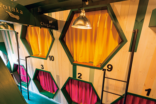 とくに特徴的なのが、客室の内装。カラフルなカーテンで仕切られた「カラマツ」や世界各国の国立公園のポスターが飾られている「ホタカ」など、秘密基地のような相部屋にはそれぞれにコンセプトが設けられており、今年は洋室のコンセプトルームも誕生。