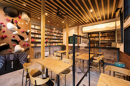 小屋隣接の「TOKUSAWA BASE」。ボルダリング体験ウォールや図書スペースなど、充実した時間がすごせる。