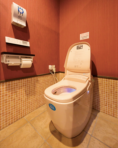 清潔感あふれる水洗型の温水洗浄便座付き洋式トイレ。2016年に改装し、シックな内装で落ち着いた空間。男性用もあり。