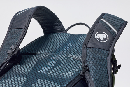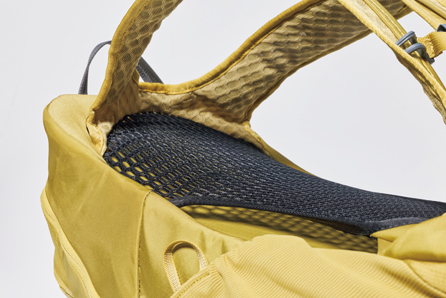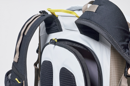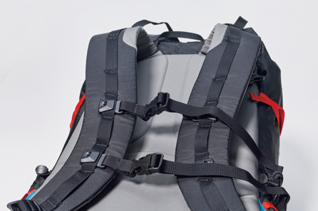 背負うというより「着る」装着性が向上。縫い目を排したショルダーハーネスが、身体の曲面、動きに追随する。見た目はシンプルだが、両サイドにポール収納可能なタテ型ポケット、分別収納しやすいショルダーポケット装備で、使い勝手のよさも光る。