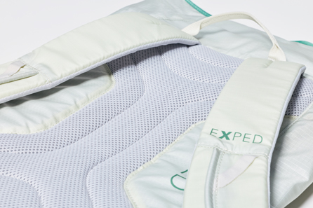 背面メッシュパネル装備の高通気パック。ウエストベルトはストレッチ仕様で、固定感と運動性を両立。ショルダーハーネスは肩に肉抜きパッド、胸部は薄手のメッシュ地のみ。涼しさと腕の可動域をプラス。細かなギミックで、小型パックの機能を高めている。
