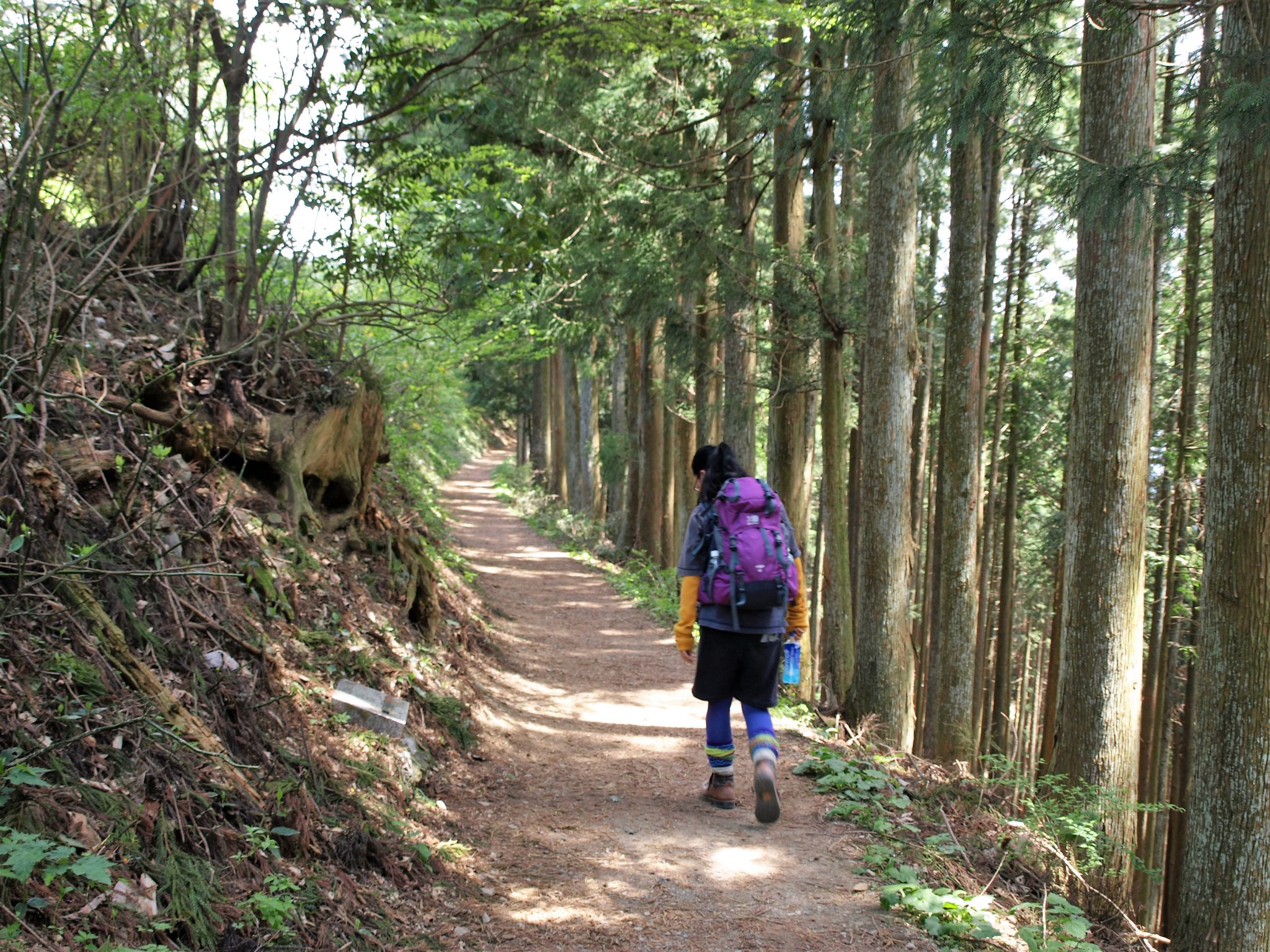 日の出山から南東方面へ、金比羅尾根を下りる。この尾根道はマウンテンバイクの愛好者には知られた存在で、山頂から一気に駆け下るライダーがたくさん。ただ、彼らのマナーは総じてよく、登山者が迷惑をこうむることはない。