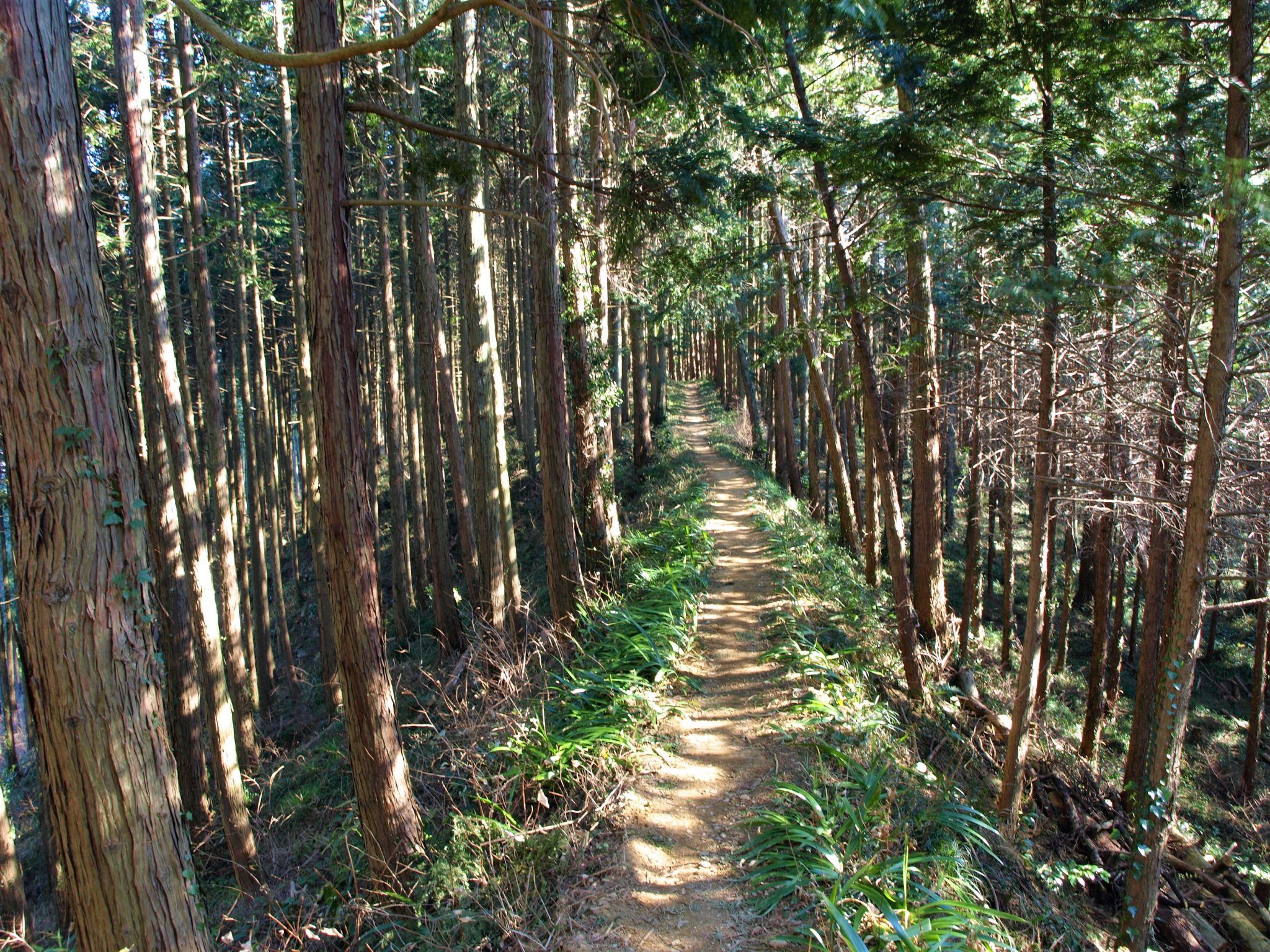 下り出しは急ですが、その後はダラダラと下っていく。足裏にやさしく届く土の感触が心地よく、思わず足の運びも早くなりがち。白岩ノ滝への分岐は直進して、静かな山頂の麻生山も巻いて下りる。
