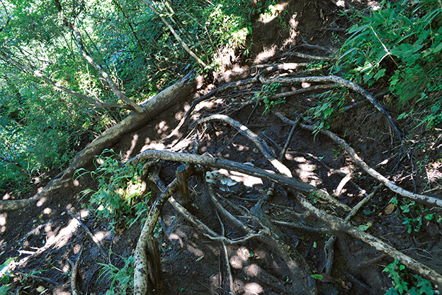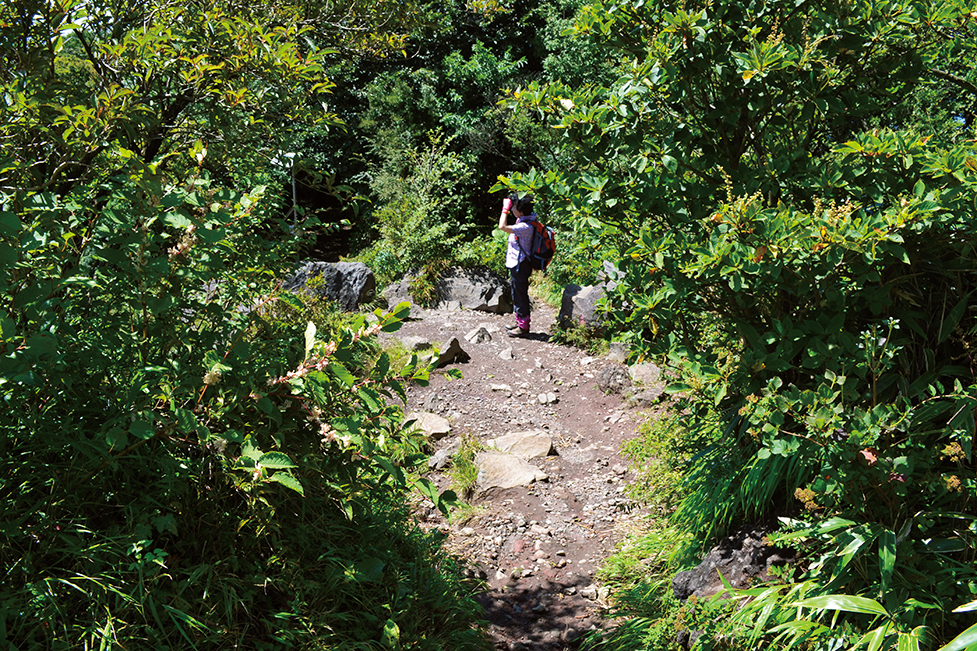 まずは、丸太が埋め込まれた階段状の道を登ろう。途中には粘土質の土が滑るため、ロープが手摺り代わりに張られた箇所がある。土が乾いていれば問題なく進めるだろう。その後、岩が堆積した登りになるので、数歩先をシミュレーションしながら進もう。