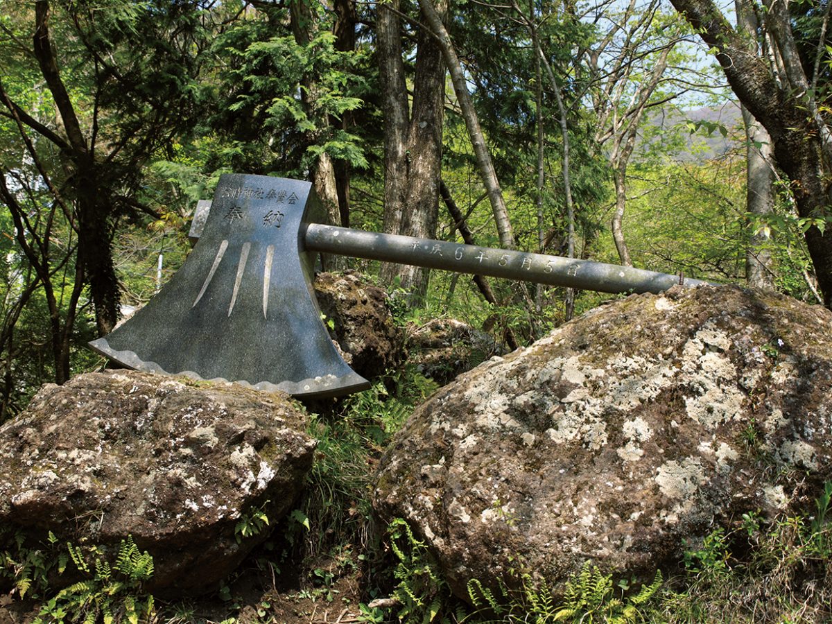 本殿に登山の無事を祈願したら出発しよう。登山道は公時神社の一段下から延びている。ヒノキ林に延びる道は日当たりがあまりよくない。坂田公時の碑をすぎ、さらに5分ほど歩いた地点に金太郎が蹴落とした岩だと伝わる、金時手鞠石がある。林道を渡って再び登山道に入ったところに奥の院があり、ここからわずかな時間で金時宿り石という大きな岩に着く。あまりの寒さで岩がふたつに割れてしまったと言われている。この前で最初の休憩をとろう。