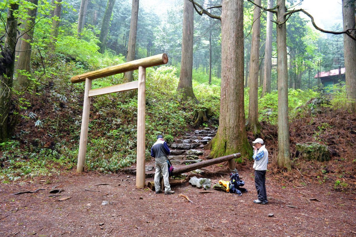 勾配が落ち着いてくると奥の院下に着く。ここで右の階段を登って奥の院から男具那ノ峰へ。荒々しい雰囲気の山頂だ。また、奥の院下からそのまま林のなかをまっすぐ歩けば男具那ノ峰から下ってくる尾根道と合流する。