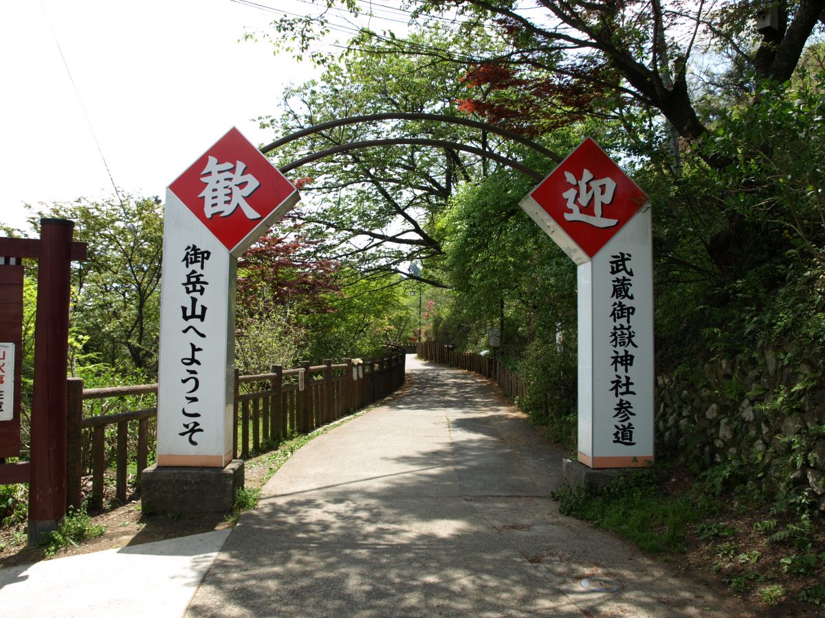 この大木の下で道が分岐する。左は日の出山に向かう道。御岳山へは正面の坂道を登る。道はすぐに右に曲がり、食事処や土産物店が並ぶ通りになる。