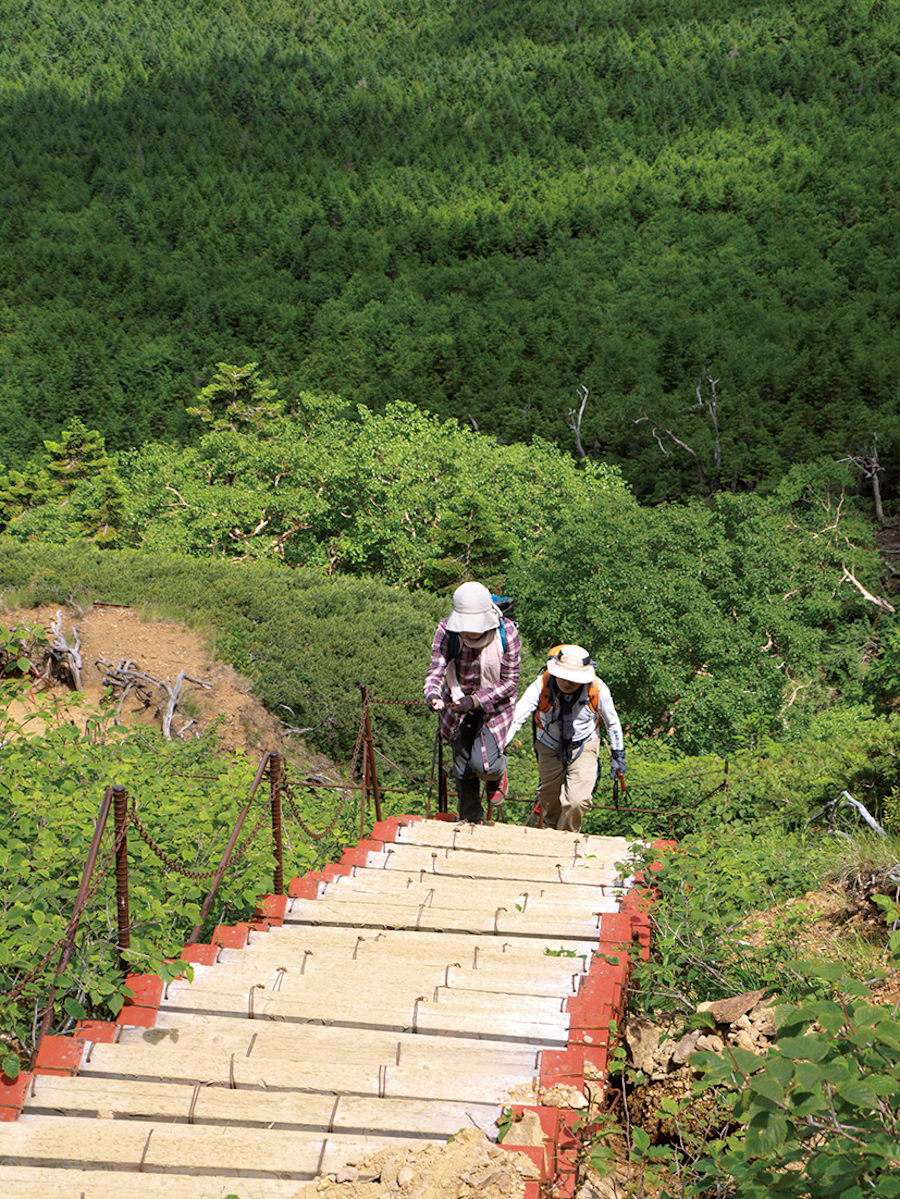 ここからは階段登りが連続。急勾配ですが、自分のペースで登っていこう。途中、階段が途切れ鎖場がありますが危険はないので安心を。息が上がったら立ち休みを繰り返しながら進んでいこう。