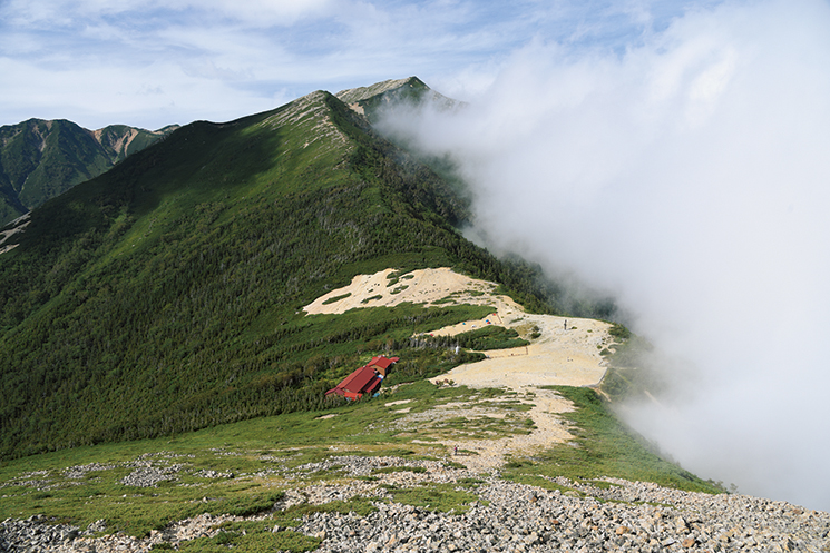 残念ながら常念乗越から山頂部分は見ることができない。見えているのは途中の岩場。岩の多いガレた道が続くので、ゆっくり登ることを心がけよう。岩に付けられた○印を頼りに登っていき、高度が上がってくると、常念乗越に建つ常念小屋や小屋の上部に立つ横通岳が俯瞰できるように。岩の上をジグザグに進んでいると、常念小屋に荷物を運ぶヘリコプターの姿も頻繁に目撃でき、右手に槍ヶ岳や穂高の山並みも見える。