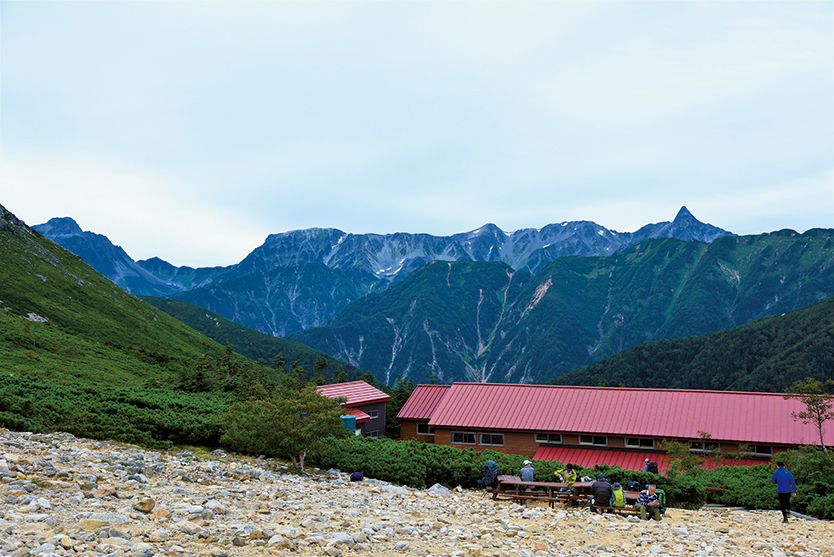 常念乗越は広く展望が抜群。ここに建つ常念小屋の後方には槍ヶ岳や穂高岳の山並みが見えている。ベンチでひと休みしたら、稜線を登って常念岳山頂に行こう。