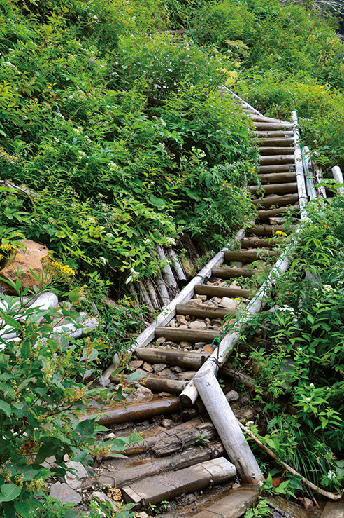 正面に見えてくる梯子は勾配はきつく、随所に梯子や階段が取り付けられている。どれも勾配がきついので、とくに下るときに注意して。その後も梯子や階段をクリアしていこう。登山道の部分には岩が転がり、足場がいいとはいえないので、転ばないように細心の注意を払うこと。正面に沢が見えると、そこが最終水場。ボトルを満たしてから出発しよう。