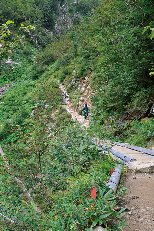 足元に笹が目立つようになると、広い河原に。ここが絶好の休憩ポイントだ。大小の岩を避けるようにして進み、丸太の梯子を登る。笠原沢を過ぎて沢をいくつか木橋で渡り、濡れた登山道を詰めていこう。このあたりから高山植物が観察できるようになる。直線的な登りだが、勾配がきつく立ち休みを繰り返すようになる。