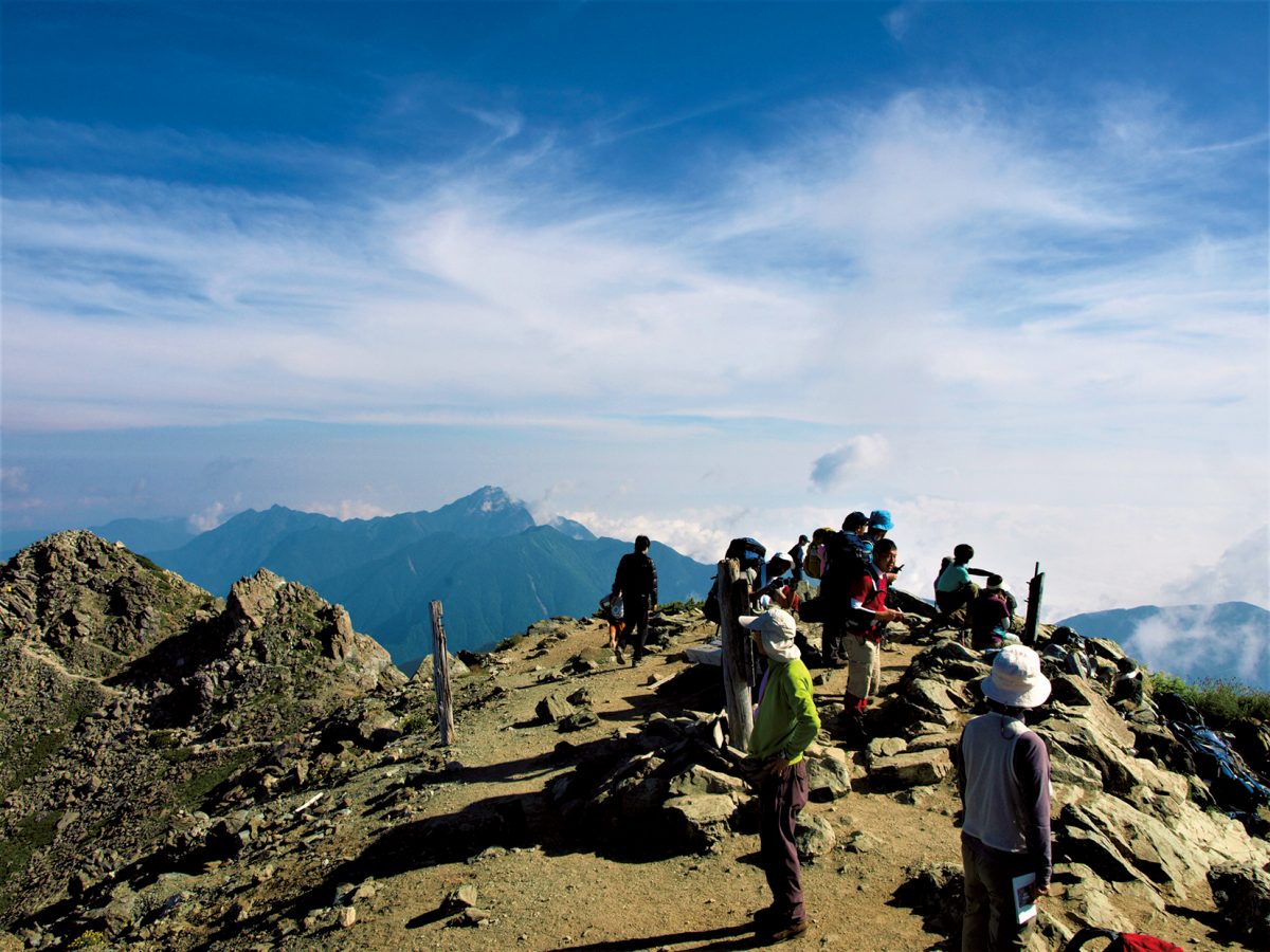 山頂は広く、夜明け前後から大勢の人で混雑することもある。間ノ岳方面から登ってくるのは、北岳山荘に泊まった人たちだ。足下には雲海が広がり、その上に富士山が頭を出し、雲海が下がっていくと北アルプスや中央アルプス、甲斐駒ヶ岳や鳳凰三山などが顔を出す。時間の許す限り、のんびりするといいだろう。