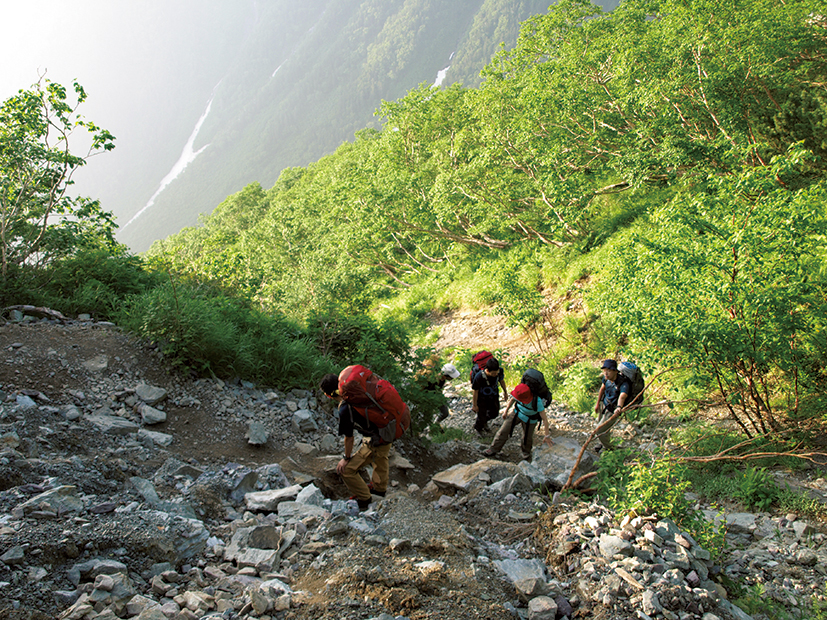 ここから草スベリといわれる急坂を登る。そのため、小屋の前では十分に休憩しておこう。食べ物や飲み物でエネルギーを補給するのは重要だが、ドカ食い、爆飲みは禁物。逆に疲れて体が動きにくくなることがある。