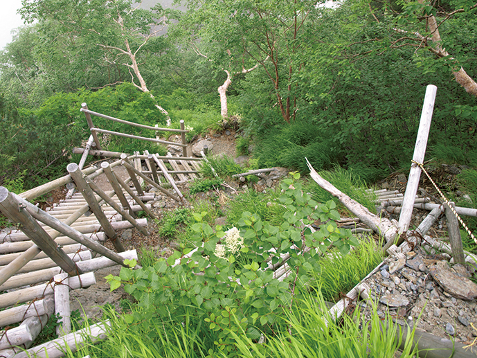20分ほどで白根御池小屋分岐に出る。ここで大樺沢二俣経由で山頂を目指すルートを見送り、右の道へ。意外に勾配がきつい道が続く樹林帯を登っていくと、点々と木のハシゴが現れるが、ここではすべて登りに使用することになる。勾配がよりきつくなるとところどころにベンチが置かれているので、適当な場所で休憩しながら登っていこう。