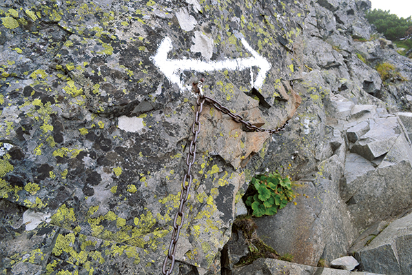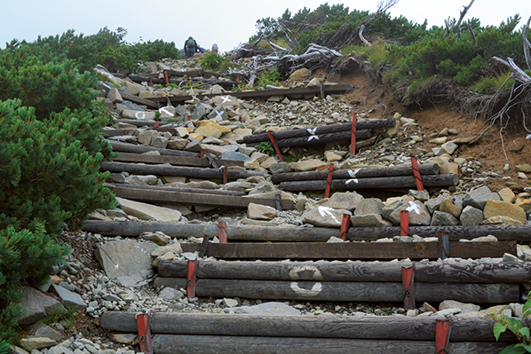 丸太で組まれた急勾配の登山道を登ると、岩が堆積した斜面を登るようになる。○や←のペンキマークが小まめに付けられているので、見失わないようにしよう。もし、このマーキングがなくなったら、滑落の危険があるため、すぐにわかるところまで引き返すこと。とくにガスに巻かれることも多いエリアだけに注意しよう。