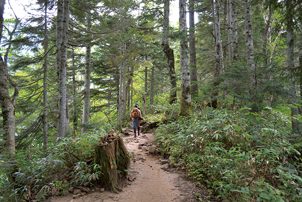 歩き出しは公園のような道が続き、樹木の間から西穂高の山並みが見える。木道歩きが終わると、登山者だけの世界になる。少し岩の多い登山道を歩くが、苦労することはないだろう。晴天なら笠ヶ岳が見えるはず。