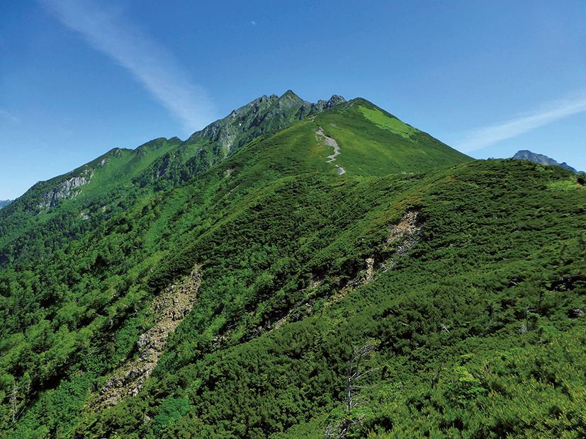 丸山から進行方向を眺めると、ハイマツ帯にくねくねと延びる登山道が見える。ここを進むのだが、大小の石が堆積していて足を取られるのでバランスを崩さないように登ろう。