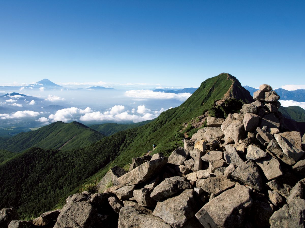 大きなケルンが立つ辺りが山頂だ。展望は雄大で、北八ヶ岳方面や南八ヶ岳主脈が一望できる。眺めを楽しんだら硫黄岳山荘へ向かおう。