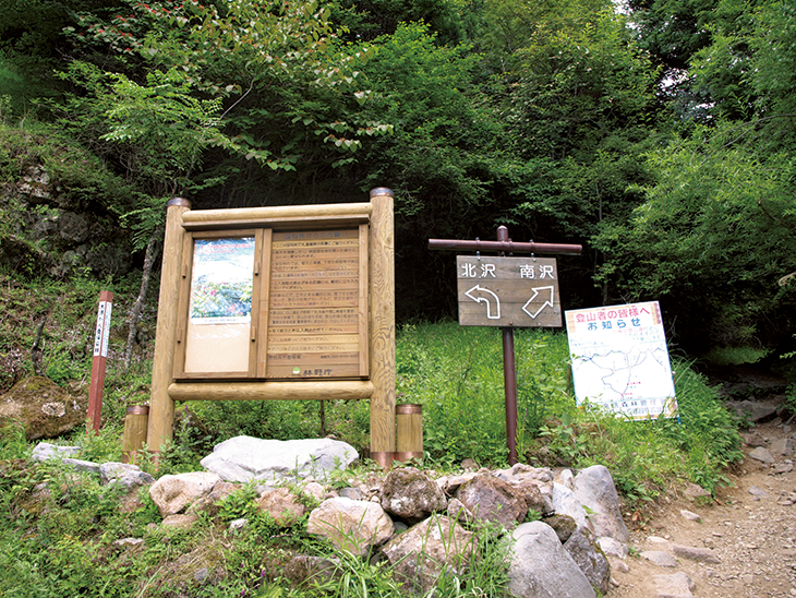 ここから2本の登山道が延びている。南沢コースは行者小屋への道、北沢コースは赤岳鉱泉に通じる道だ。この北沢コースは比較的広めの林道で、1時間ほど歩くと終点の広場に到着する。