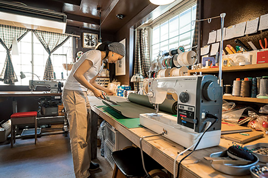 オリジナル商品は奥の工房で生まれる。ミシン踏みは妻の恵里さんが担当。